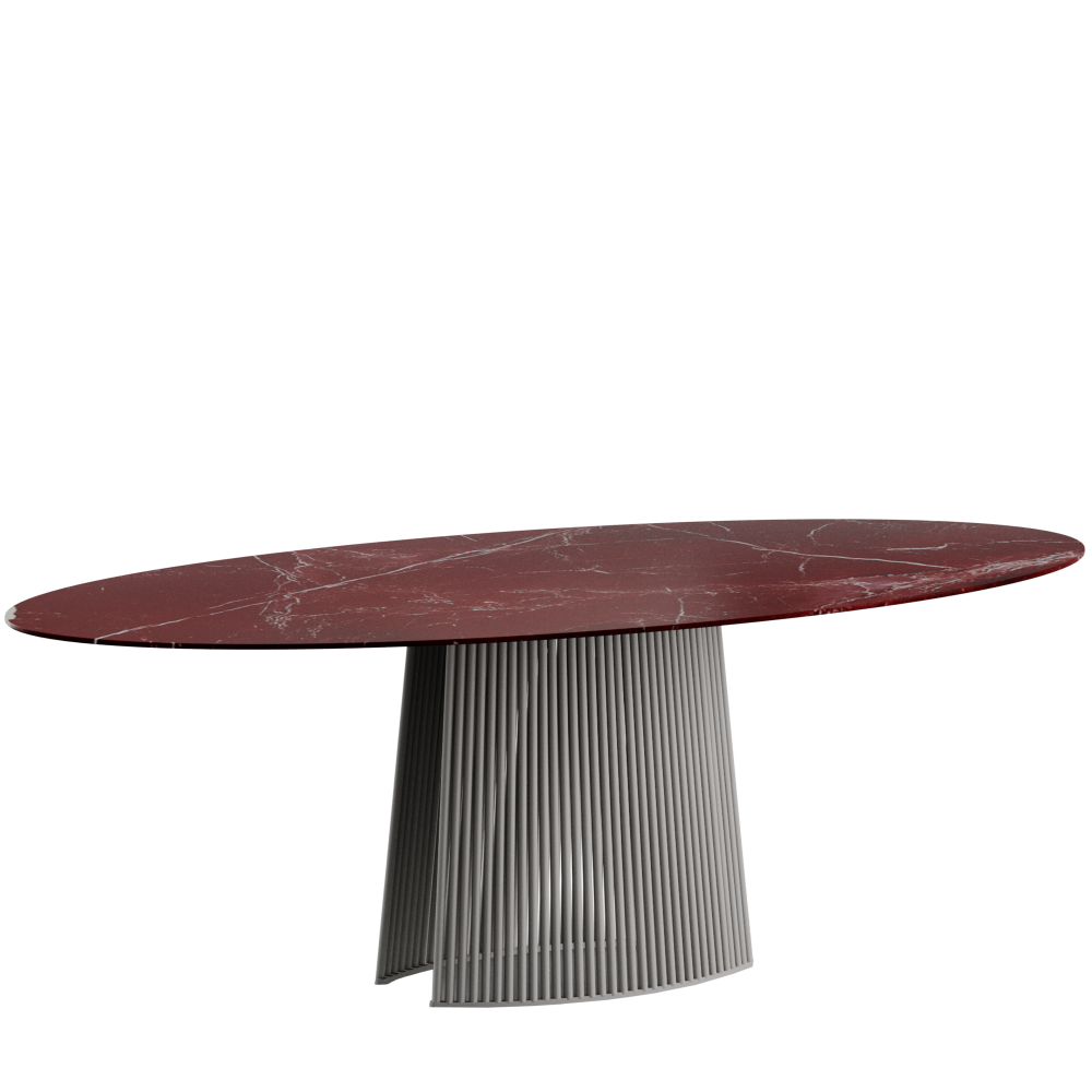 Customers can personalize their table with an oval or round tabletop available in wood, marble, laminate, or lacquer. The legs are meticulously constructed from metal pipes, mirroring the elliptical shape of the upper table. This modern design seamlessly adapts to various settings, whether at home, in a manager’s office, or a restaurant, offering options for circular and elliptical tables with compatible feet.