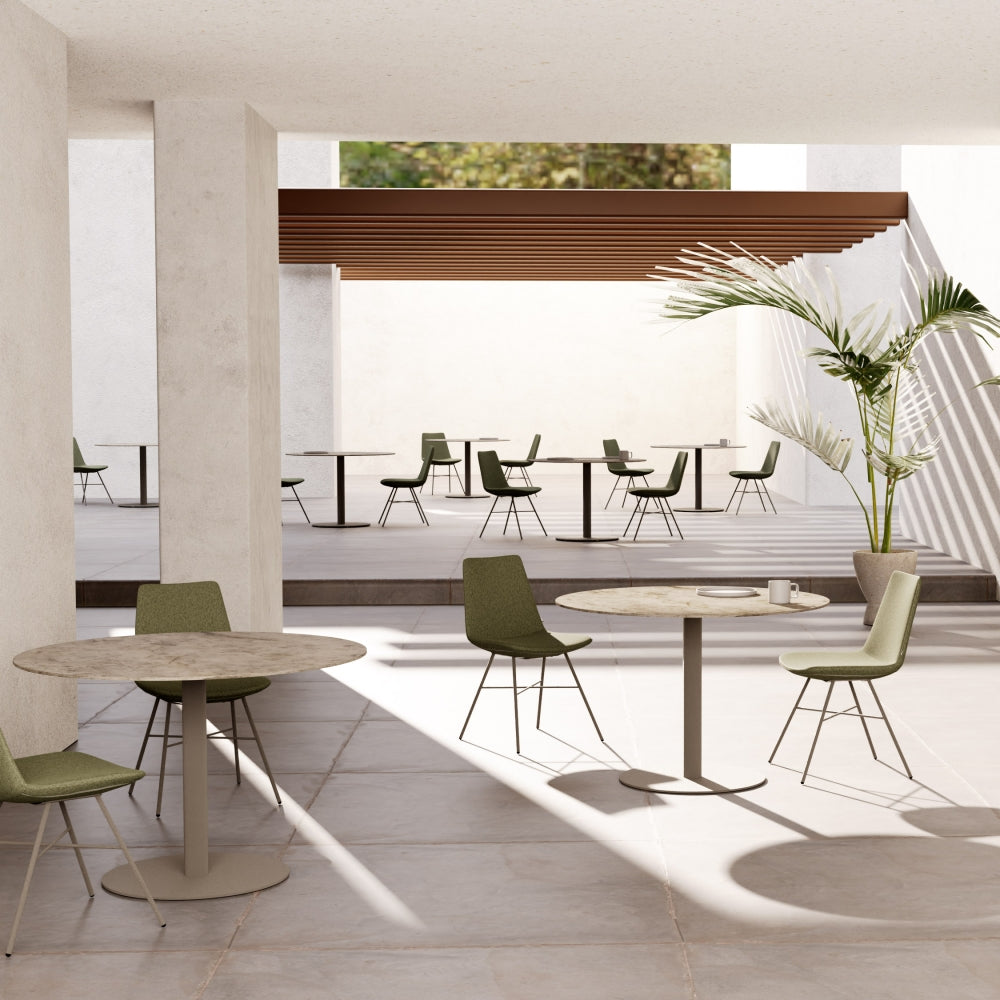 Introducing the Globe occasional bistro table by B&T Design. The Globe table tops are crafted in elliptic, square, or round shapes, and the base can be customized with static paint colors available in the B&T Design metal color catalog. This enduring product is an excellent solution for high-traffic environments such as restaurants, cafes, and public areas. Given its durability, it’s well-suited for placement on the dining floors of shopping malls, contributing to hygiene and cleanliness. Additionally, the acrylic tables are ideal for institutional dining rooms.