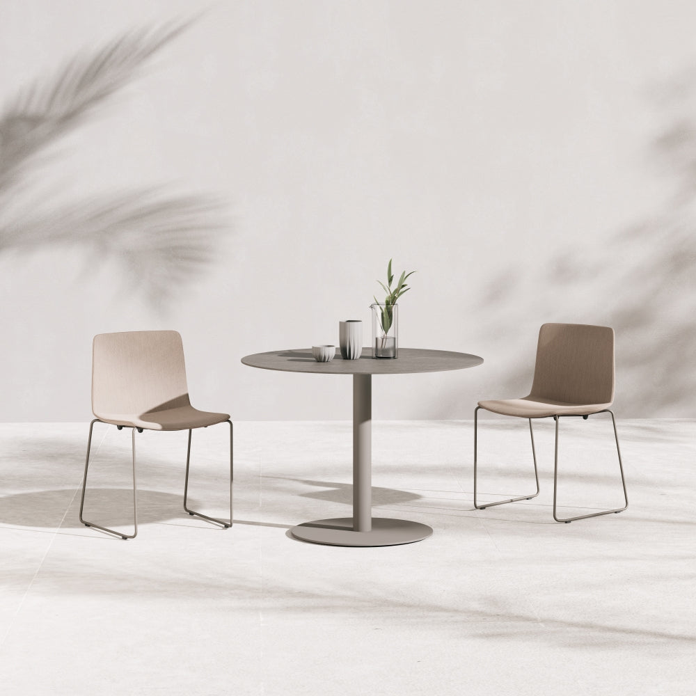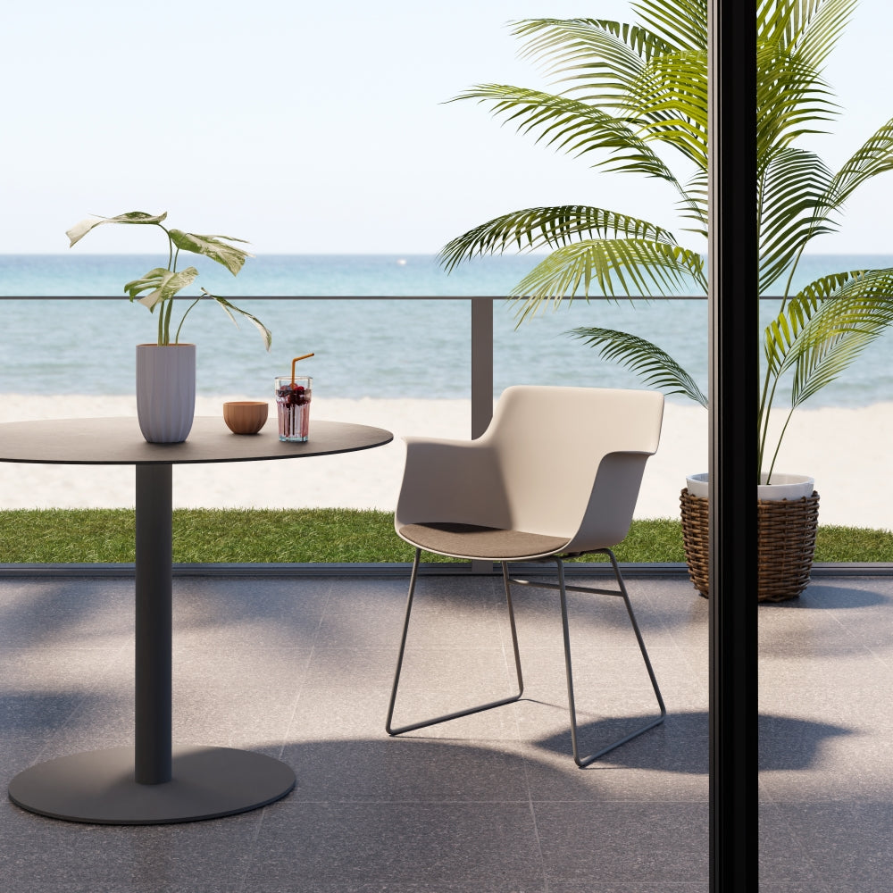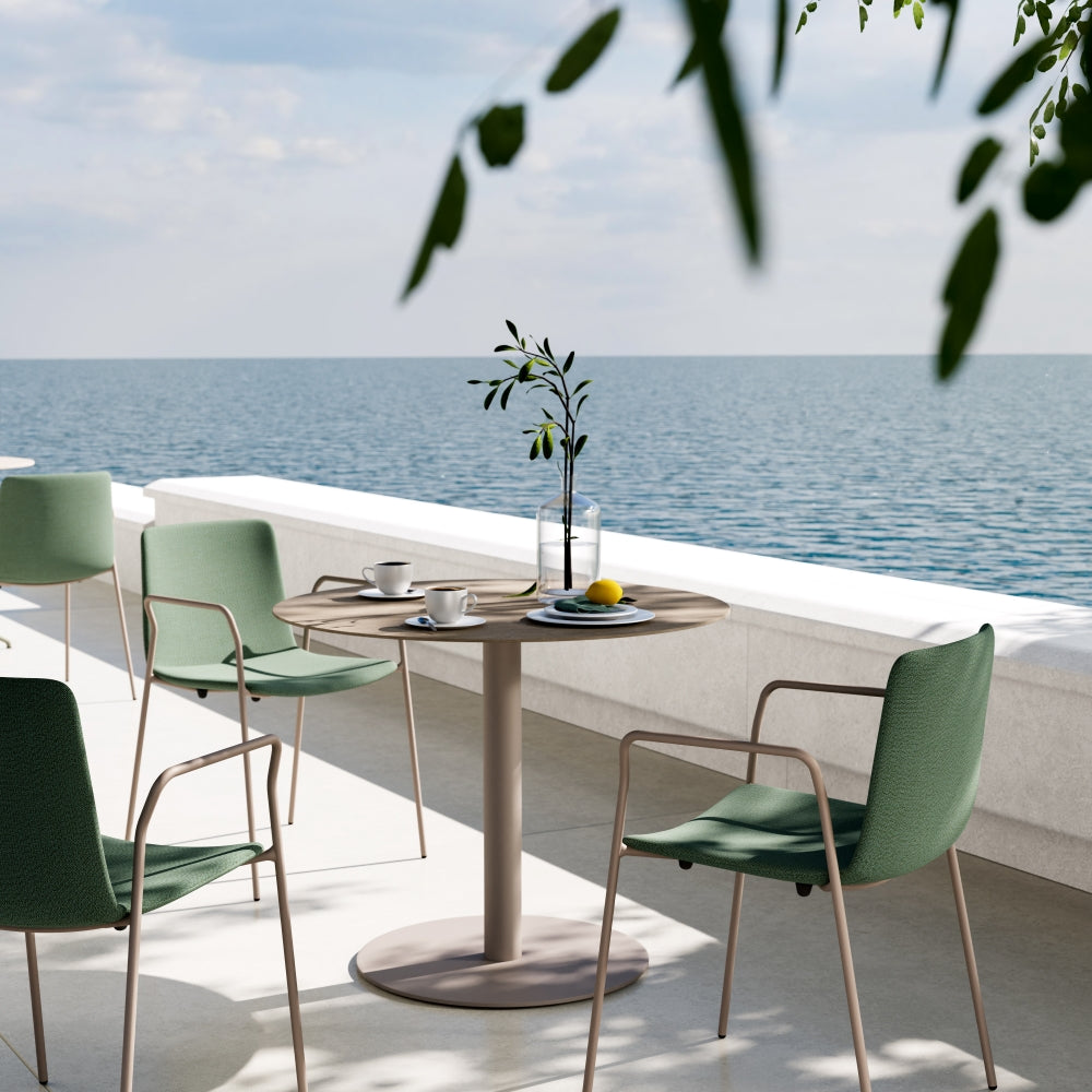 As one of the remarkable designs of the B&T indoor collection, the Globe table and coffee table duo is updated with durable and long-lasting materials and can be brought to terraces, gardens, verandas, and the outdoor spaces of restaurants and hotels while supporting the aesthetic and refined style. With its technical stone upper table and its metal legs coated with cataphoresis where all the colors in the chart can be applied, it supports creativity and can be customized. Rendering free its simple but strong effect with its versatile usage alternatives, Globe offers flexible usages where different heights can be matched with each other and the table and the coffee table can be placed together or separately.