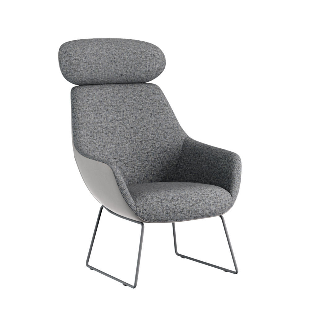 The chair provides a personalized experience in lounge areas, offering options like a headrest and ottoman. Lamy comes with various base options, including sled, metal cone, wooden cone, metal rotating mechanism, and swivel feet. The customization extends to the choice of fabrics for the headrest and seating area, allowing for different colors both inside and outside of the seat.