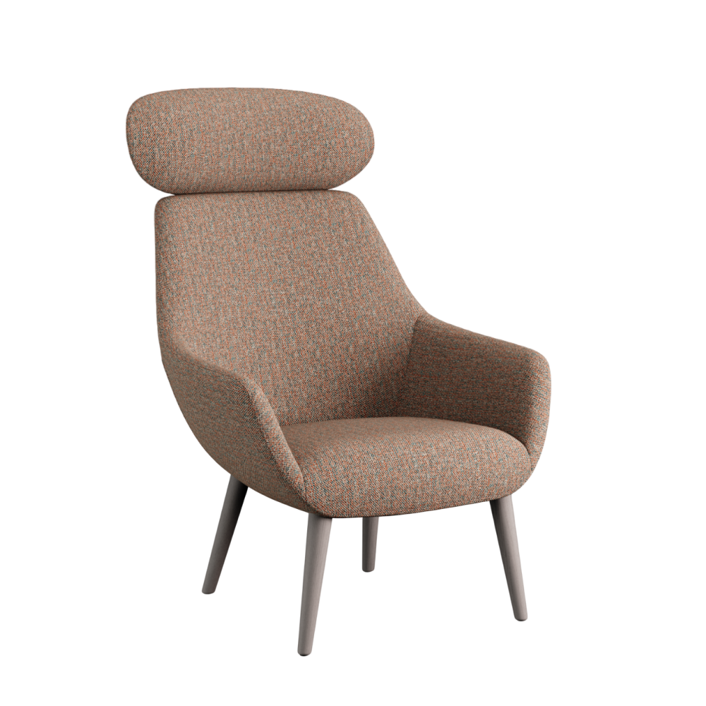 The chair provides a personalized experience in lounge areas, offering options like a headrest and ottoman. Lamy comes with various base options, including sled, metal cone, wooden cone, metal rotating mechanism, and swivel feet. The customization extends to the choice of fabrics for the headrest and seating area, allowing for different colors both inside and outside of the seat.