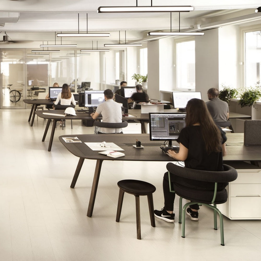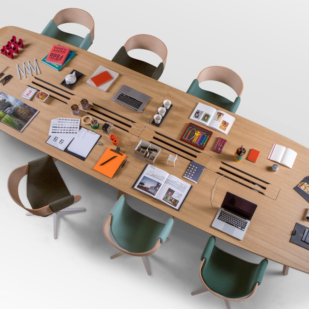WING is a table created for working areas, but it can also fit inside a home-office or domestic environment. It is characterized by a wooden frame inspired by the sawhorse of the working tables, and the rounded shape of the top with its contemporary lines. Defined by great flexibility, WING can be completed with acoustic panels, a brass reading lamp and wooden or metal trays that are installed on the large central channel through a magnetic fixing system. Power supply and cable management are allocated on the same central channel.