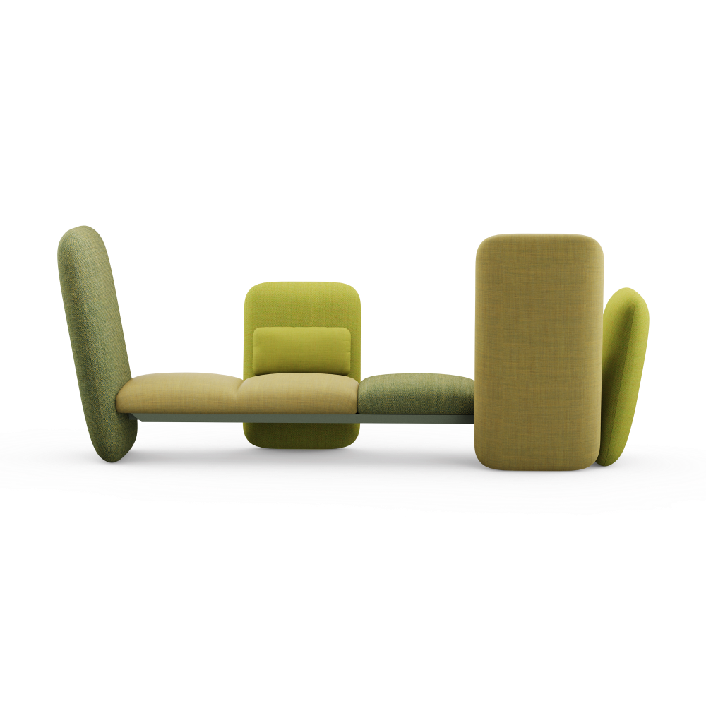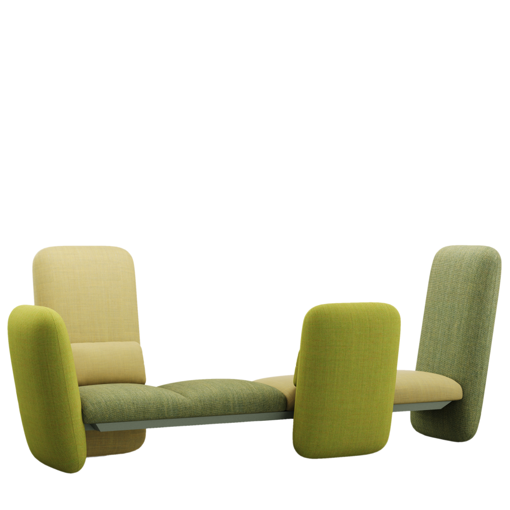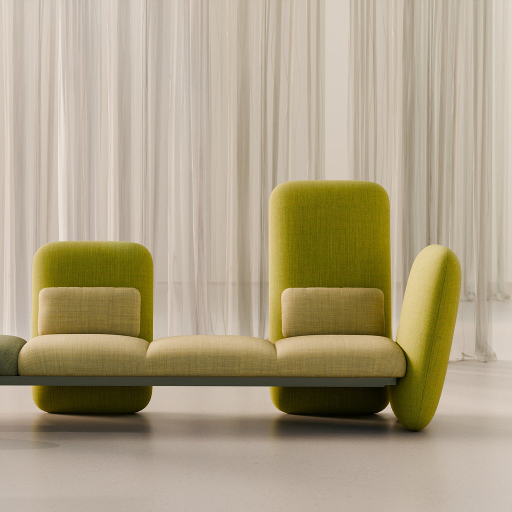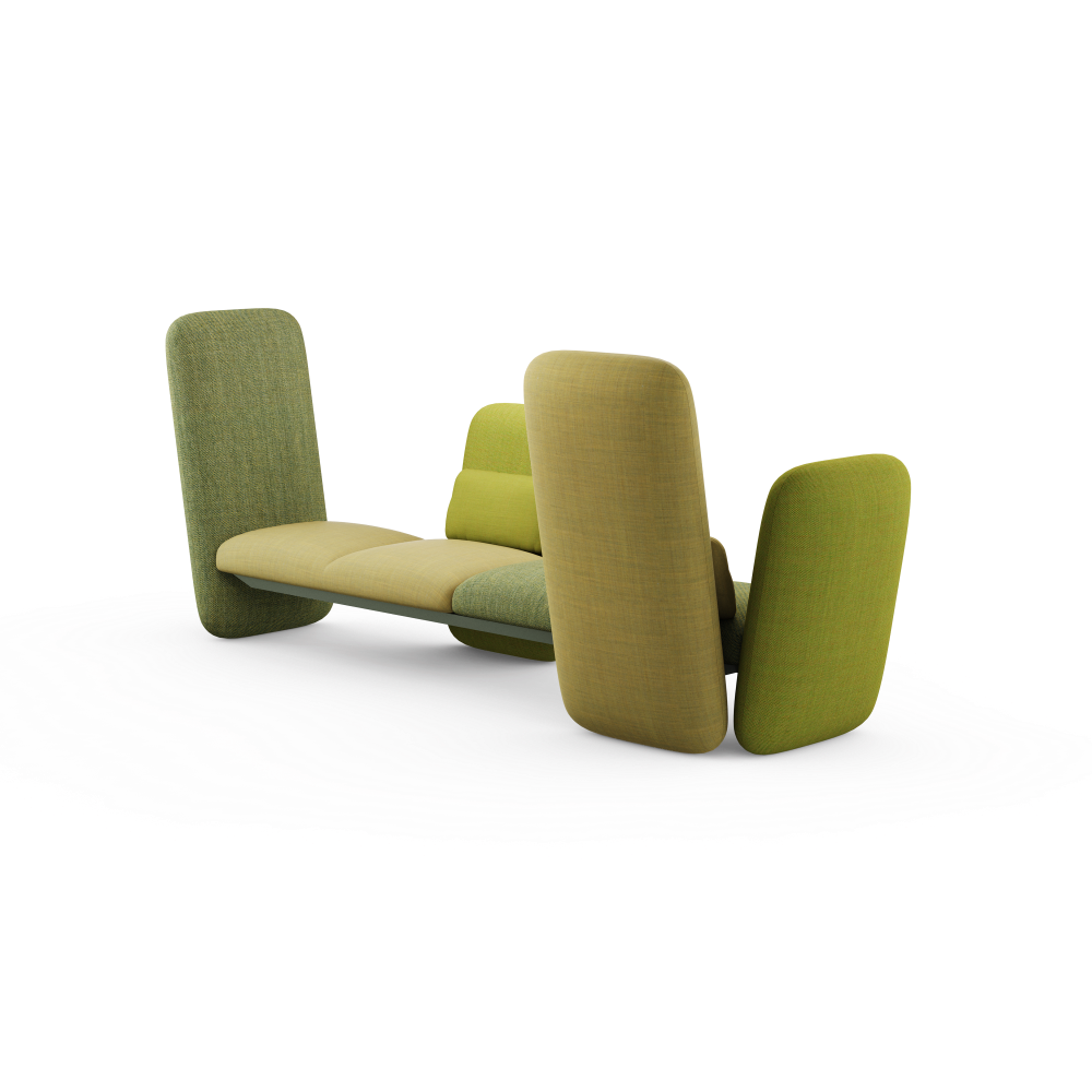The design’s signature comes from its interplay of color, geometry, and verticality, with high and low backrests functioning both as support elements and as sculptural dividers that shape the surrounding space. These upholstered back panels create a dynamic rhythm, turning a seating product into a spatial statement.