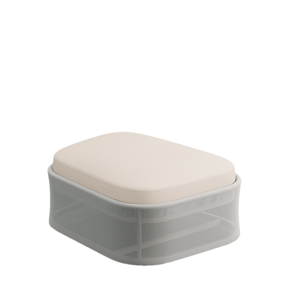 The PLAT family seamlessly combines indoor comfort with a straightforward design, offering a harmonious blend of aesthetics and functionality with its unique form. Designed to be a versatile addition to the family, the pouf serves as a flexible piece that can function as both a seat and a side table. Despite its monumental appearance, the PLAT family is lightweight and easily portable, thanks to its aluminum inner frame structure.