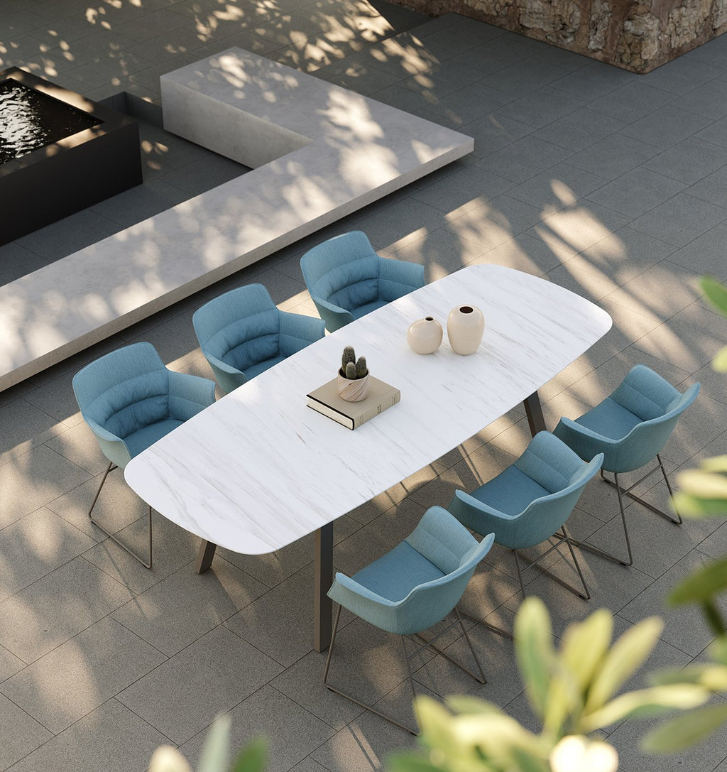 Adaptable to outdoor settings with its thin and lightweight structure, Rego offers freedom and customization with seven different leg alternatives, choices for completely upholstered or only upholstered seating, and a variety of color options.
